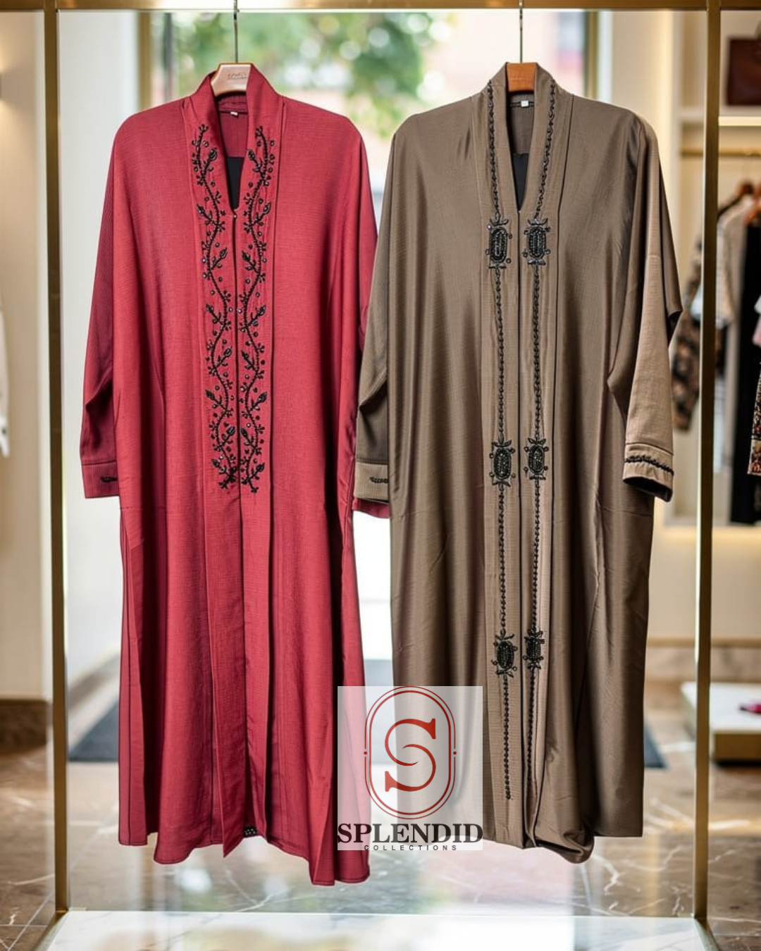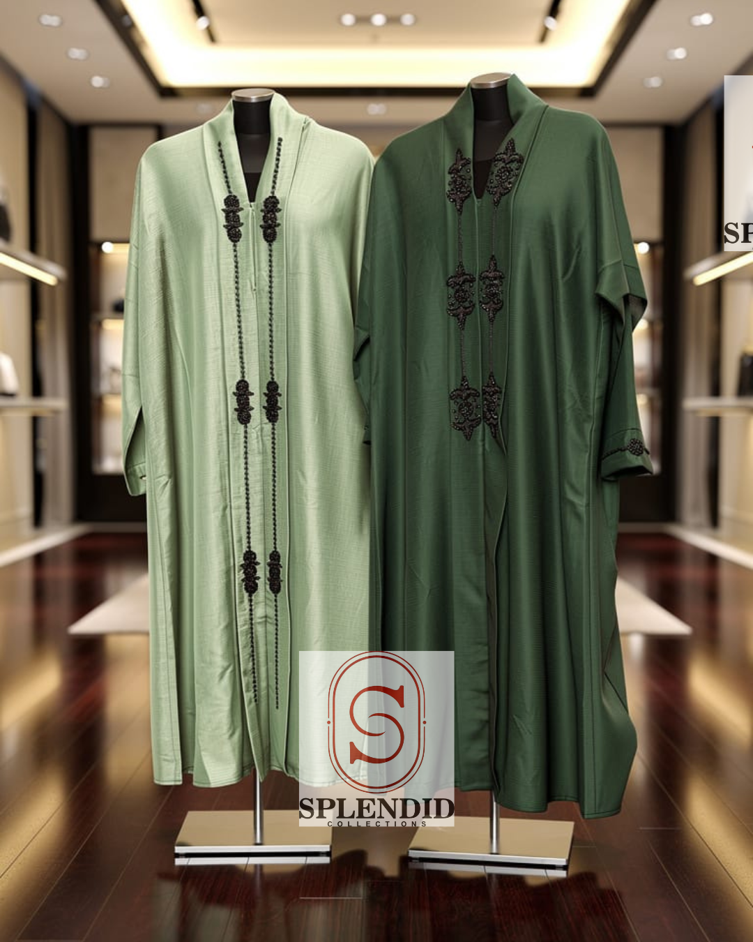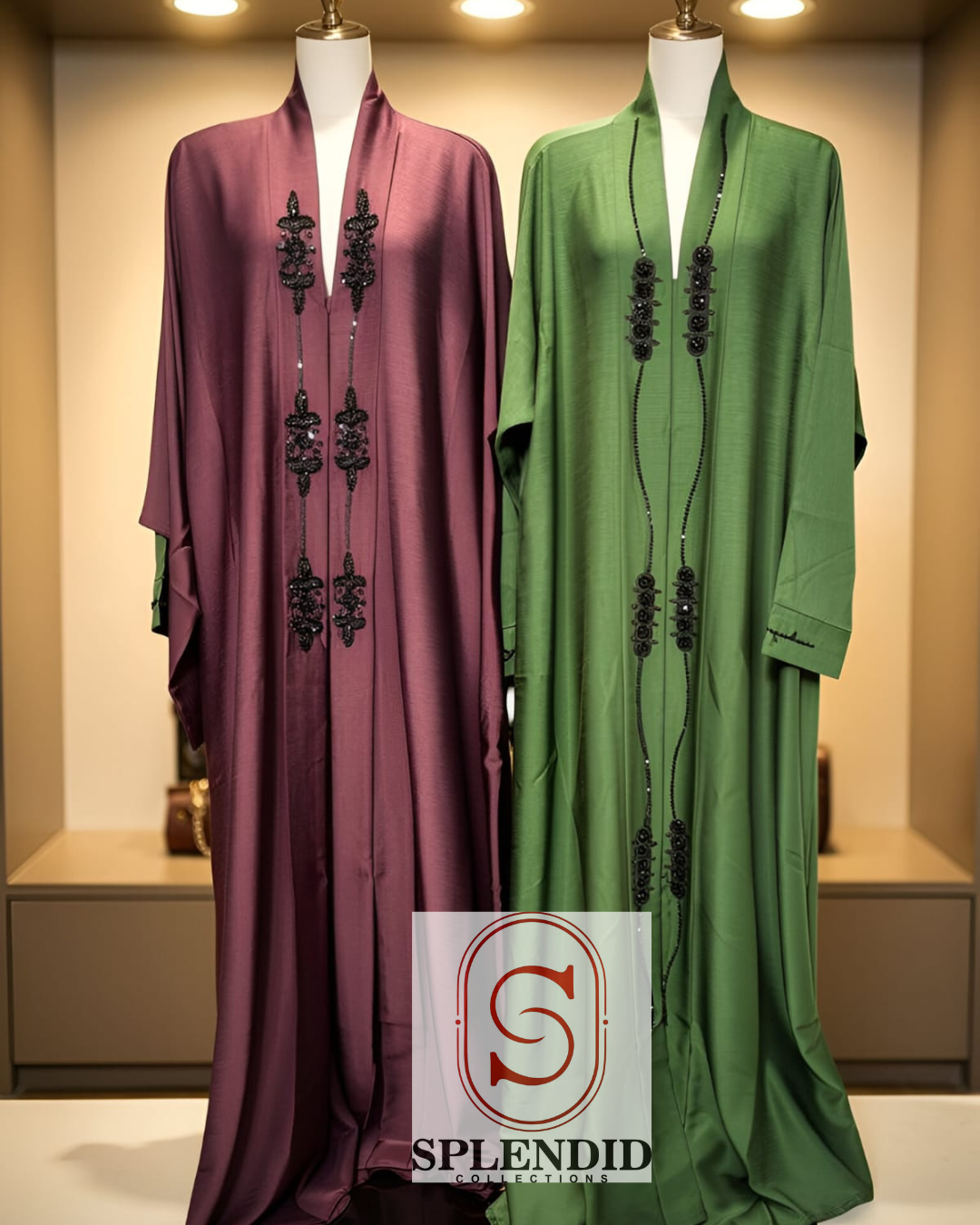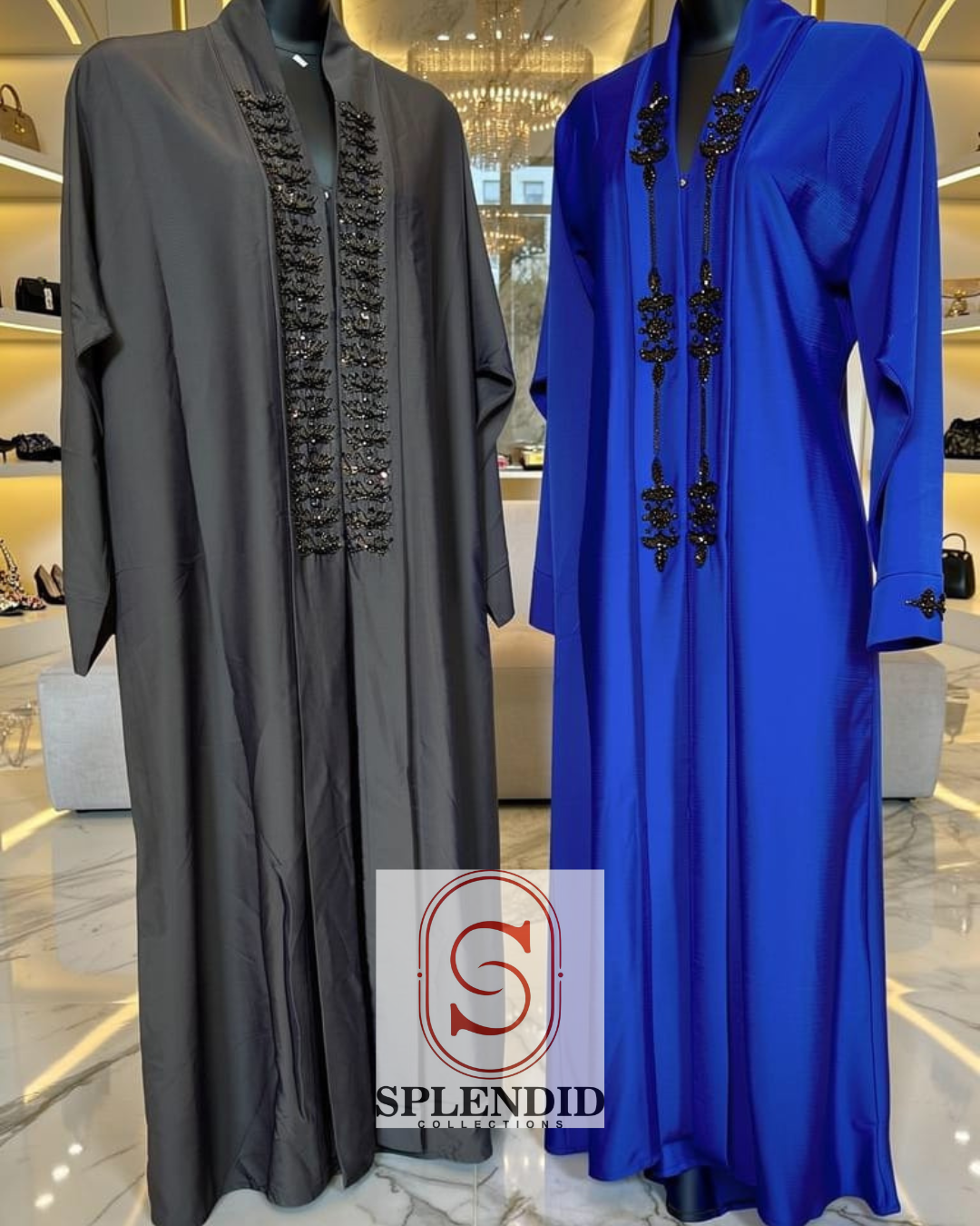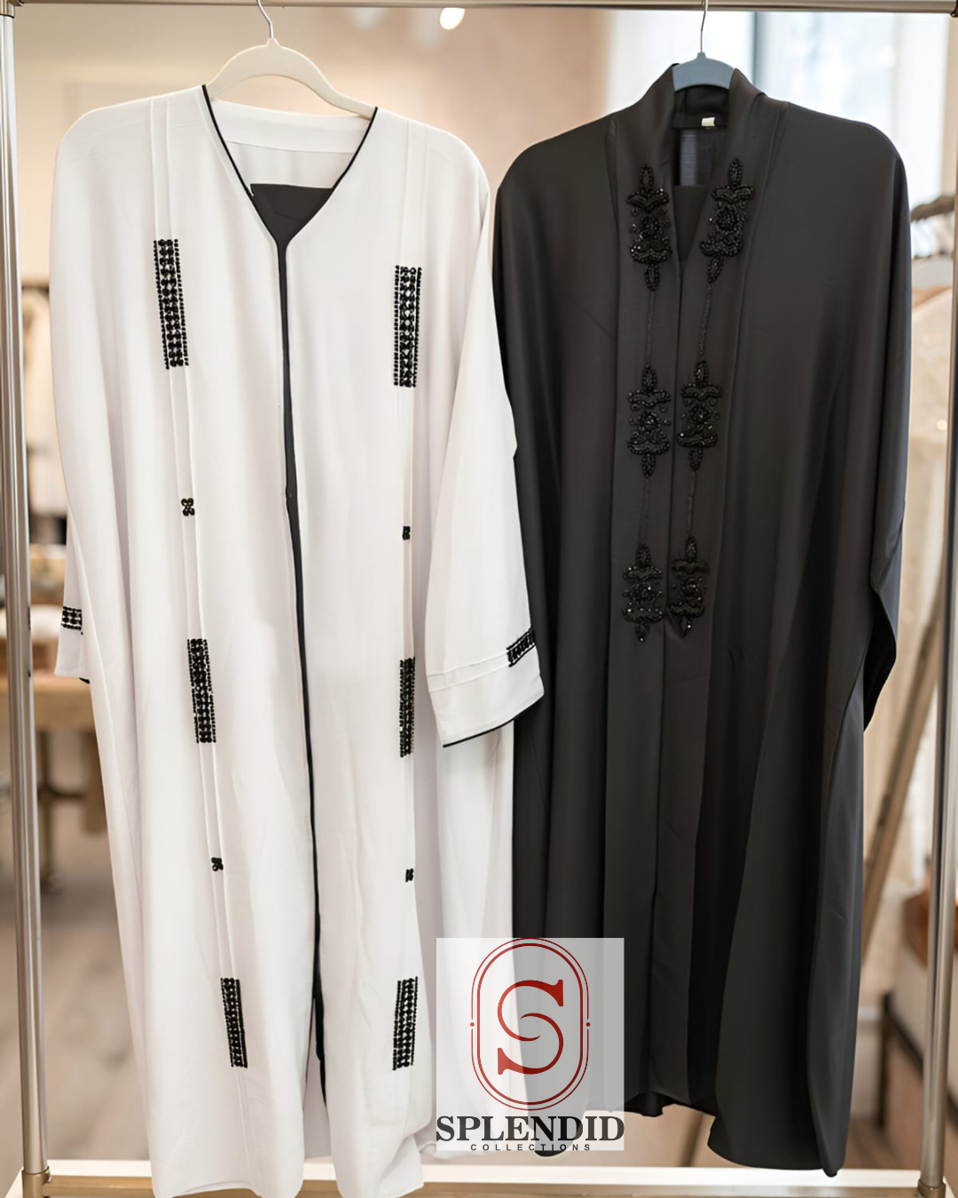 Experience effortless elegance. Our latest collection from Splendid Collections brings together traditional modesty and contemporary luxury. Crafted from premium, breathable fabric, each abaya features hand-placed beadwork and intricate embroidery along the lapels and cuffs. Fabric: High-grade Korean Crepe / Nida (Adjust based on actual fabric). Features: Open-front style, detailed beadwork, matching sleeve accents....